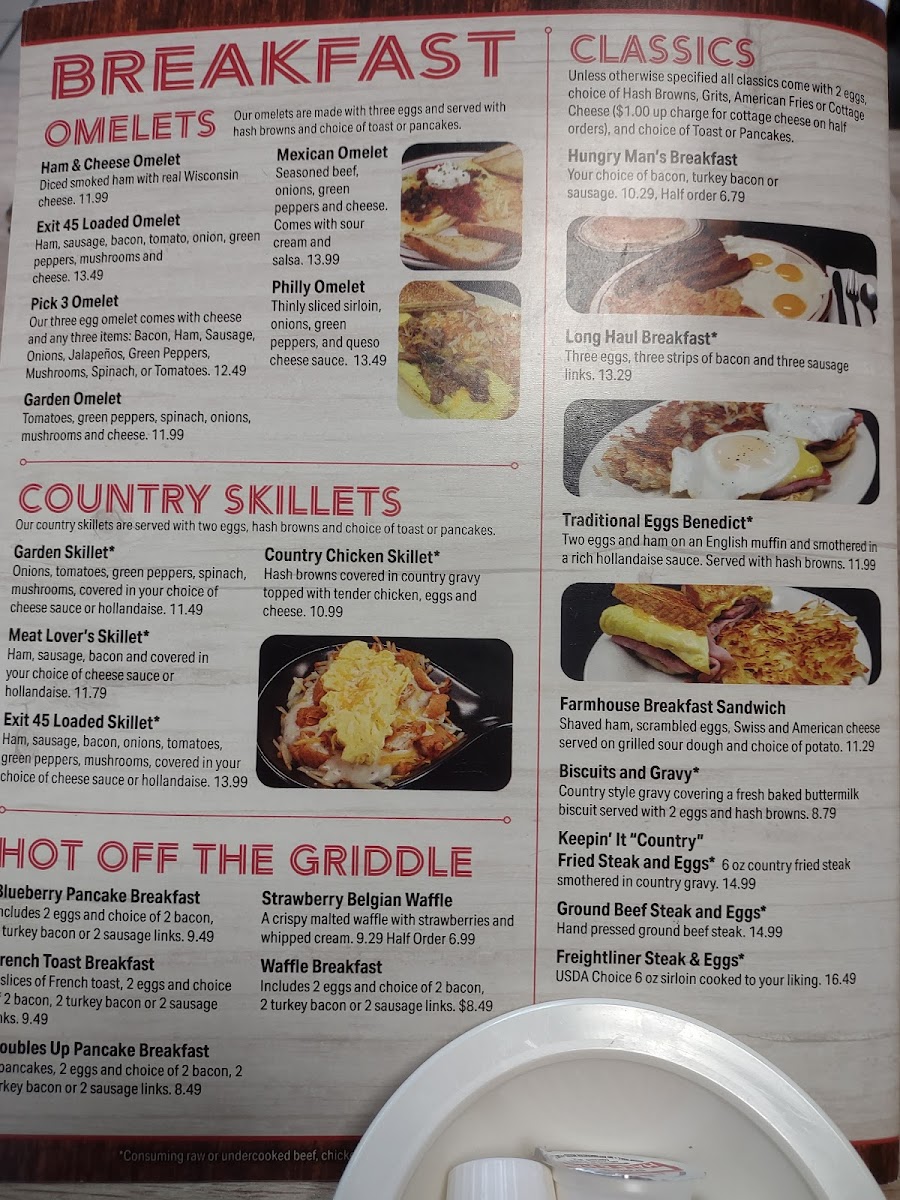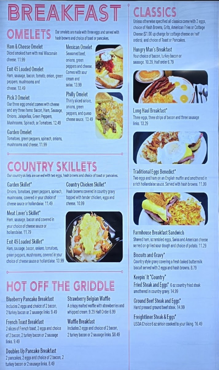 Unless otherwise specified all classics come with 2 eggs, choice of hash browns, grits, american fries or cottage cheese ($1.00 up charge for cottage cheese on half orders), and choice of toast or pancakes. Your choice of bacon, turkey bacon or sausage