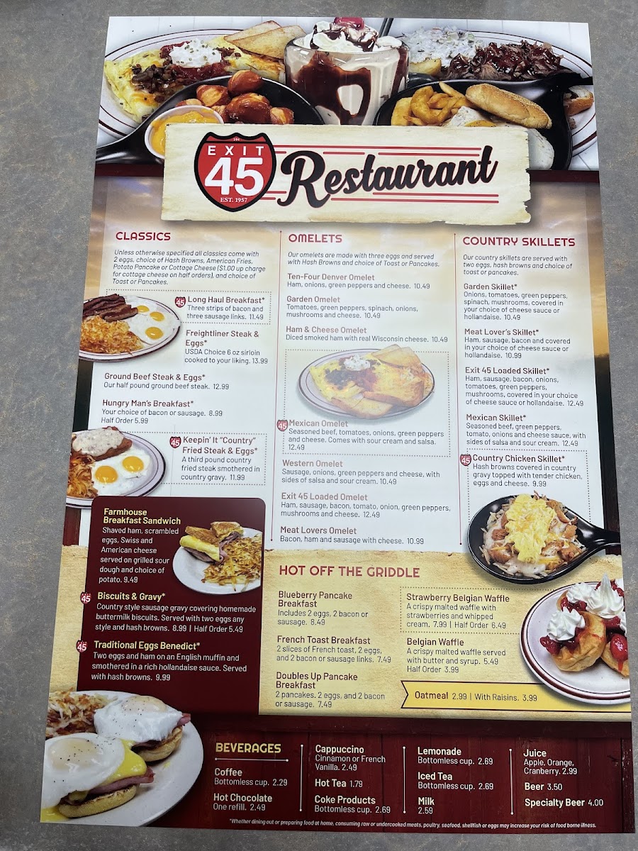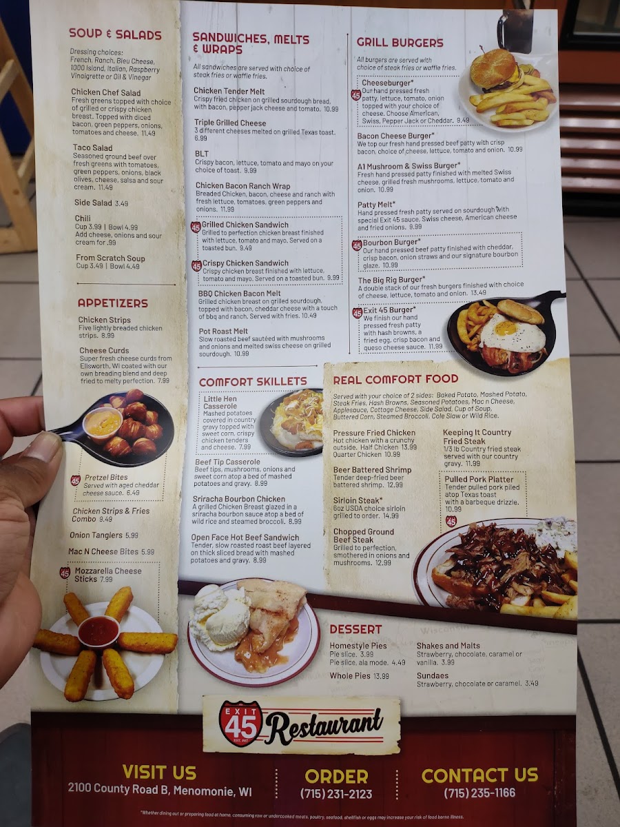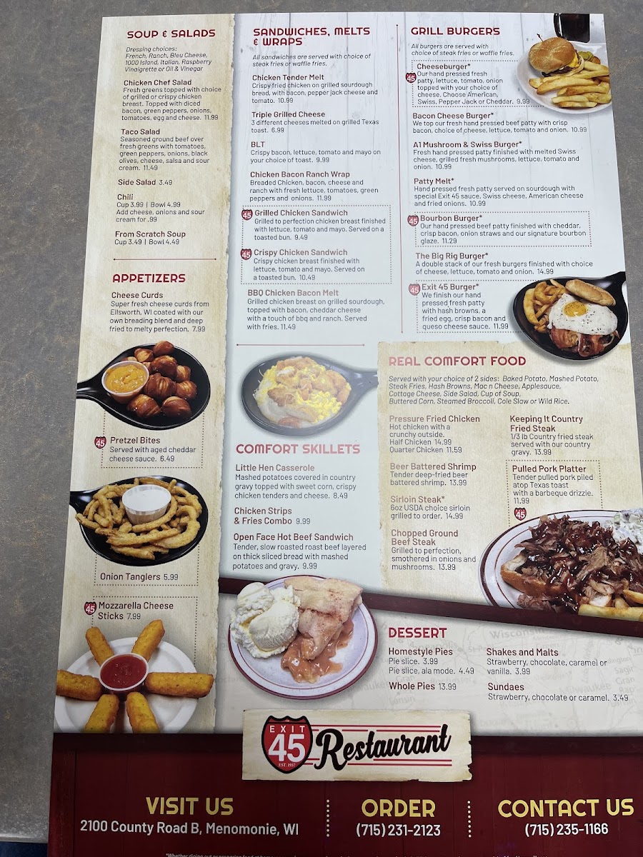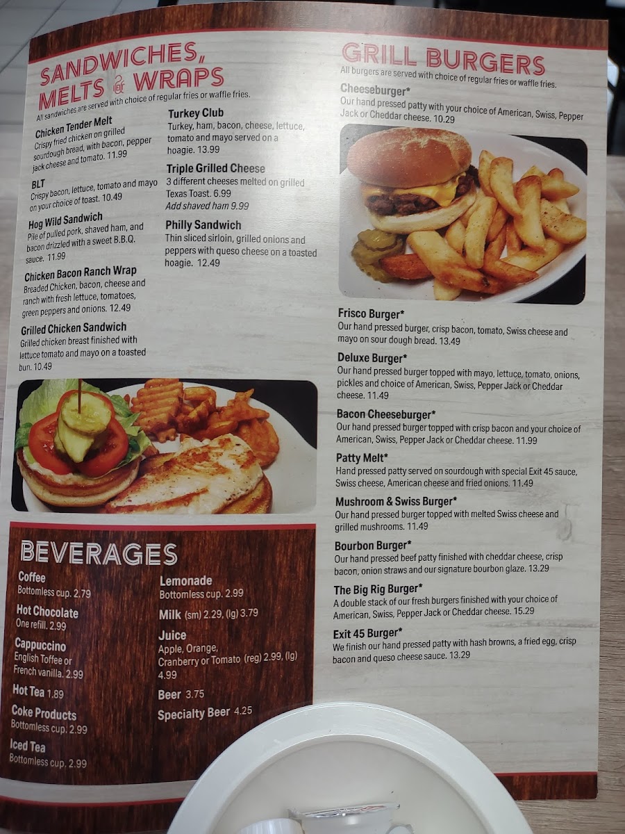 All burgers are served with choice of regular fries or waffle fries. Hand pressed burger served on sourdough with special Exit 45 sauce, swiss cheese, american cheese and fried onions