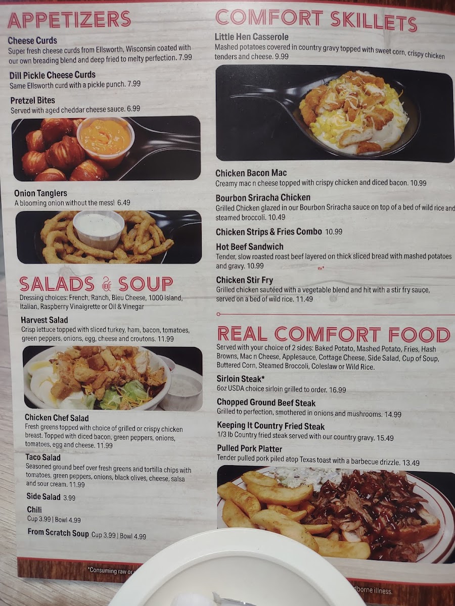 Our country skillets are served with two eggs, hash browns and choice of toast or pancakes. Hash browns covered in country gravy topped with tender chicken, eggs and cheese